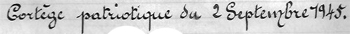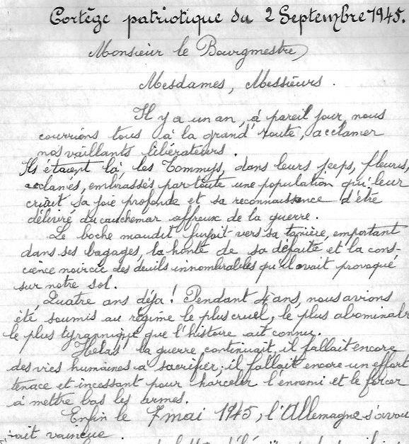 Le 2 septembre 1945, premier anniversaire de la Libération, un grand cortège parcourut les rues du village ; ce fut après Moustier le plus beau et le plus grandiose de la région. Nous avons grimé 90 personnages, payé pour 12.000Fr. de costumes et de tapisseries à Messieurs Dupuis et Tréhoux, de Tournai. J’avais une magnifique collection de vues du cortège ; hélas ! à l’exposition de fin d’année scolaire organisée à Pecq, la dite collection ne fut plus retrouvée ; il me reste quelques clichés que j’ai pu réunir chez les voisins.