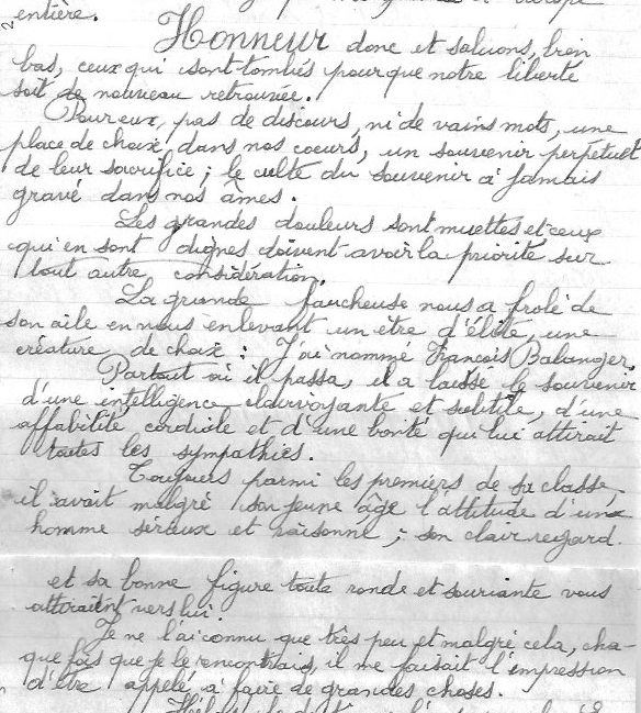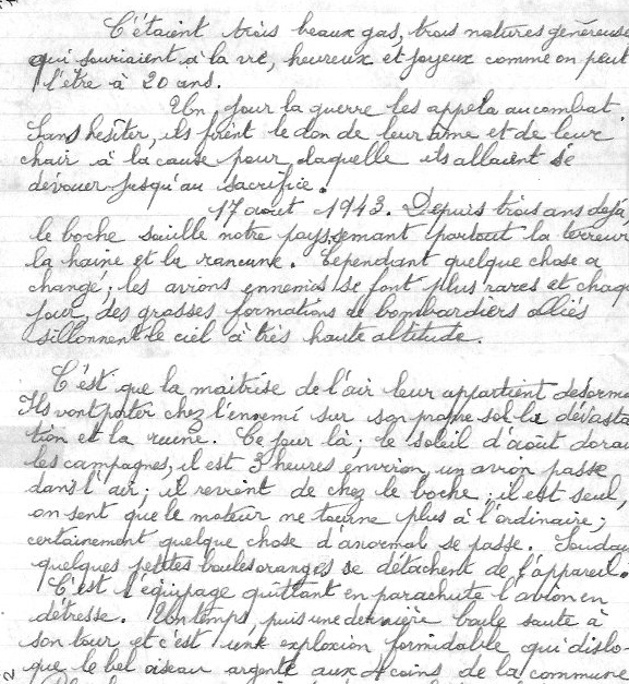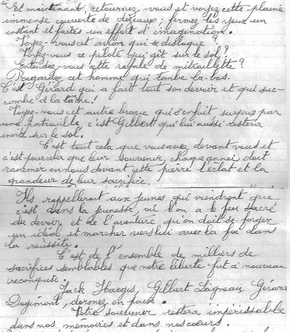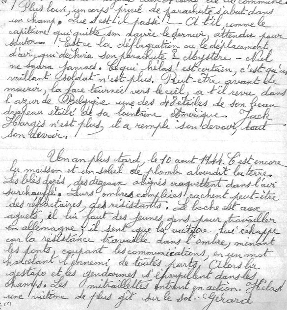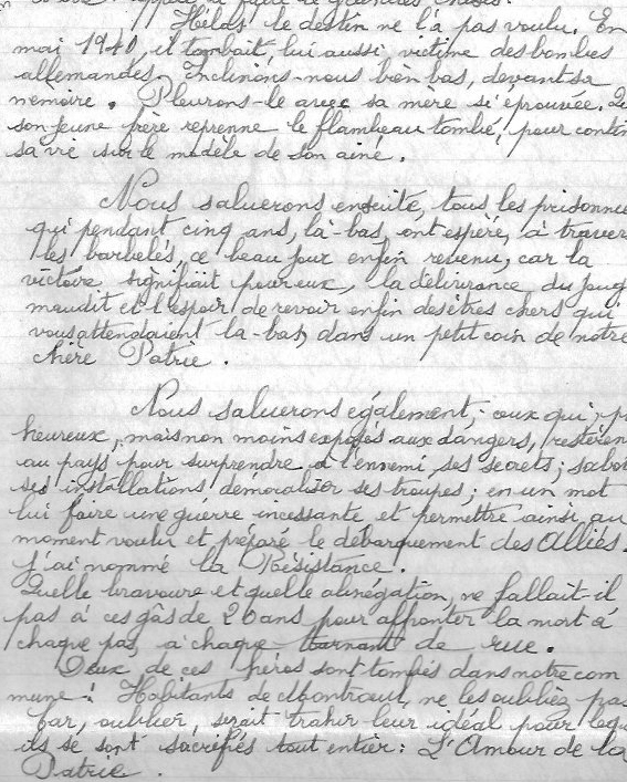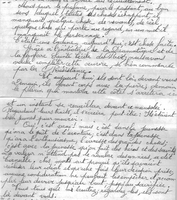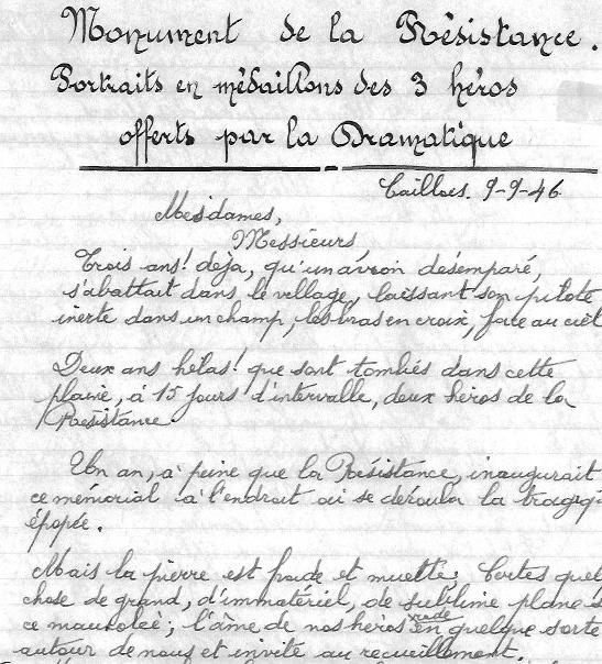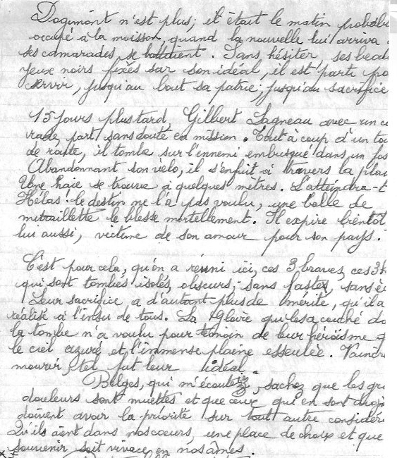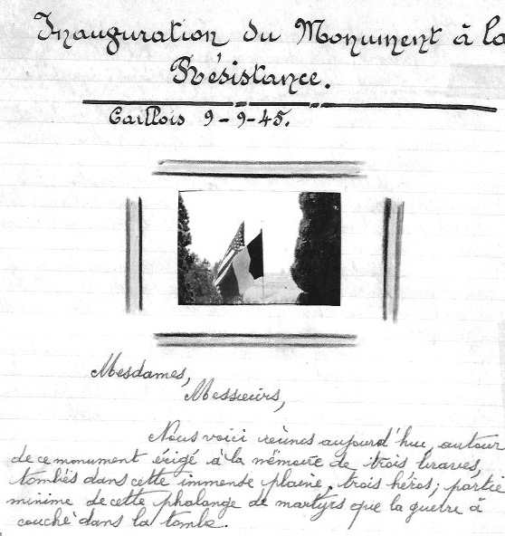 En 1943, dans le village, s’abattait un avion américain. Un an plus tard, à 15 jours d’intervalle, deux héros de la résistance, Gilbert Lagneau et Gérard Dogimont, tombaient victimes de la gestapo. La résistance leur a élevé un monument au Callois. Un an plus tard, la Dramatique du Pavé, que je préside, a joué une pièce de circonstance : « L’armée du silence » pour pouvoir acheter les photos en médaillons des trois héros, à graver dans la pierre. Voir plus loin les deux allocutions que j’ai prononcées au cours de l’inauguration du monument en 1945 et de la remise des médaillons en 1946.