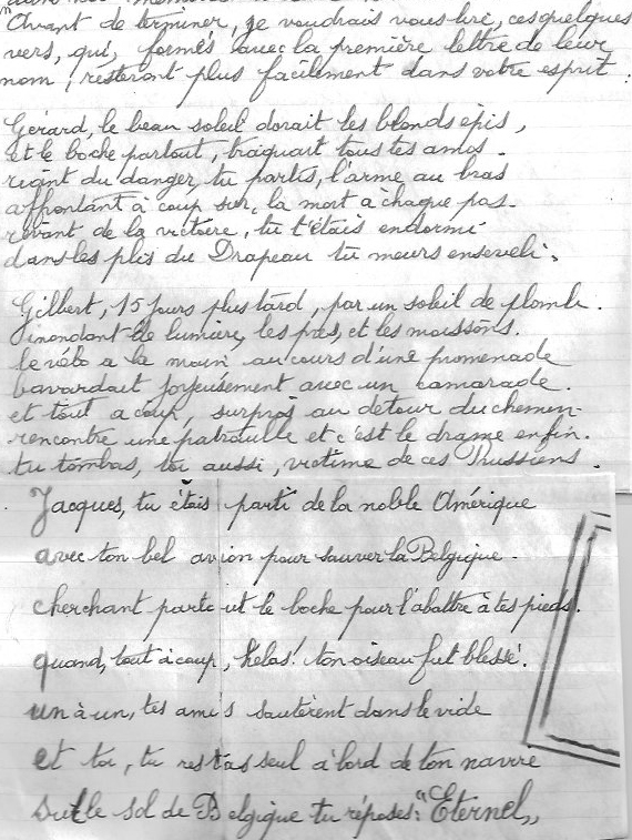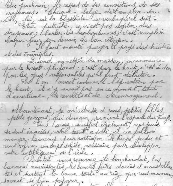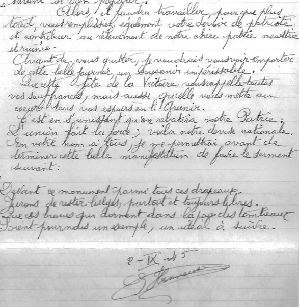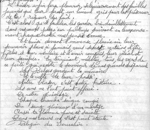 J’ai terminé. Puisse l’historique de ma petite commune, où tout se fait au ralenti et après des hésitations et des retards importants, intéresser les communes voisines. Pour ma part, j’ai toujours taché de faire aimer aux enfants ce qui est beau, ce qui est noble, ce qui est faible, soit dans la nature, soit dans le pays. On doit cultiver le culte, non seulement des héros qui sont morts pour notre liberté, mais aussi de tous ces ouvriers, artisans, employés, mineurs, etc… qui, les uns au danger, les autres avec une très grande responsabilité, ont dans l’obscurité, sans faste, sans éclat, sans coup de clairon, accompli leur tâche quotidienne et contribué à former et développer nos villages, nos villes, notre pays. Comme le disait si bien Monsieur l’Avocat Van de Kerkove, un des fondateurs de « La Libre Belgique », en 1917 : « Etre un bon patriote, ce n’est pas agiter des drapeaux, hurler des brabançonnes, c’est vivre quotidiennement sa vie de bon citoyen ; c’est remplir dans la société humaine la tâche que la destinée a voulu que vous remplissiez, avec foi, avec ténacité, avec dévouement et générosité. Les bons ouvriers, les bons artisans sont de bons défenseurs de la Patrie ».