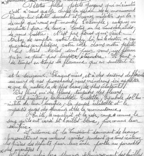 Aussi, derrière le bureau, face aux élèves, j’ai affiché un grand tableau rappelant le sens de ces vérités nationales et chaque matin après la prière, les enfants font l’appel aux morts suivi des mots : Morts pour la Patrie, et aux grandes fêtes de l’année : Toussaint ; Armistice ou en promenade, on va fleurir le monument aux morts pour la patrie.